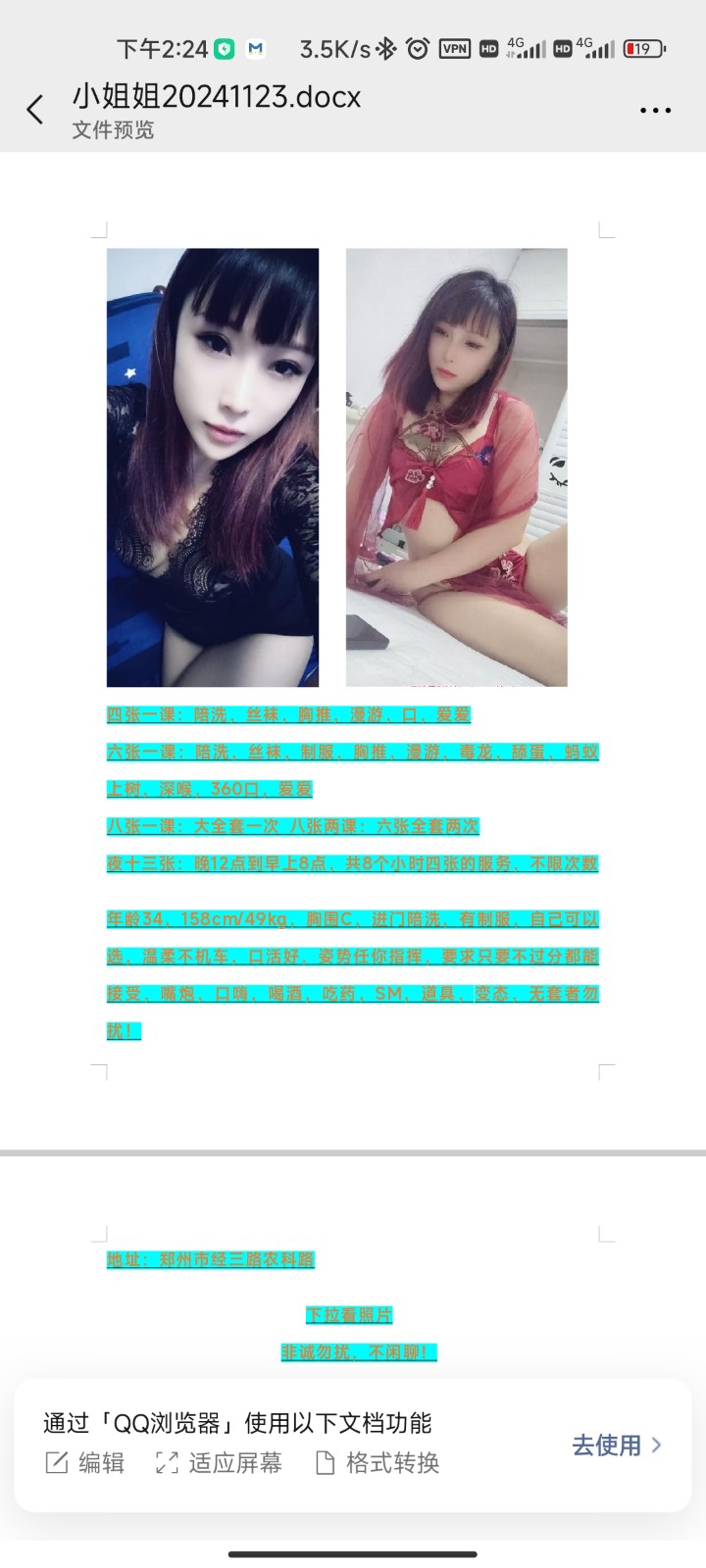 官方提示1、所有见面之前索取定金、路费、保证金、验证费、购买东西等等的都是骗子!2、引导加QQ群、下载APP、办卡都是骗子!3、上门服务付费后禁止对方以任何理由离开房间!4、将联系方式直接写到帖子内容中的都是骗子!不要精虫上脑!感觉不对劲就多看看上面这几条!不要精虫上脑!
